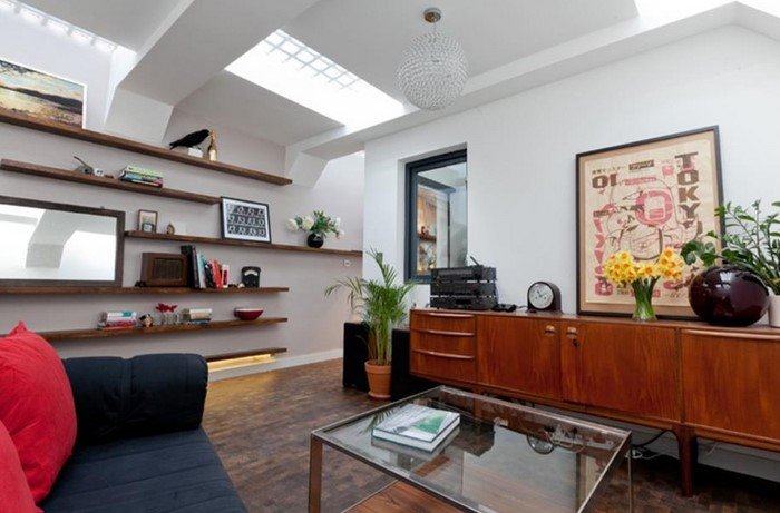 Просторная гостиная с диваном, журнальным столиком и многочисленными шкафчиками кажется весьма уютной. Обрати внимание, что одна из стен квартиры полностью отдана под полки: очень практичное решение!
