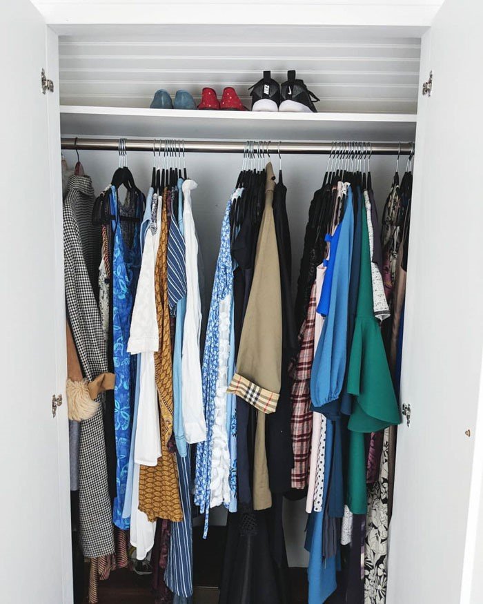 На первый взгляд гардероб здесь откровенно маловат. К счастью, дверцы открывают лишь центральный его фрагмент. Слева и справа скрывается много свободного пространства для обуви и одежды.