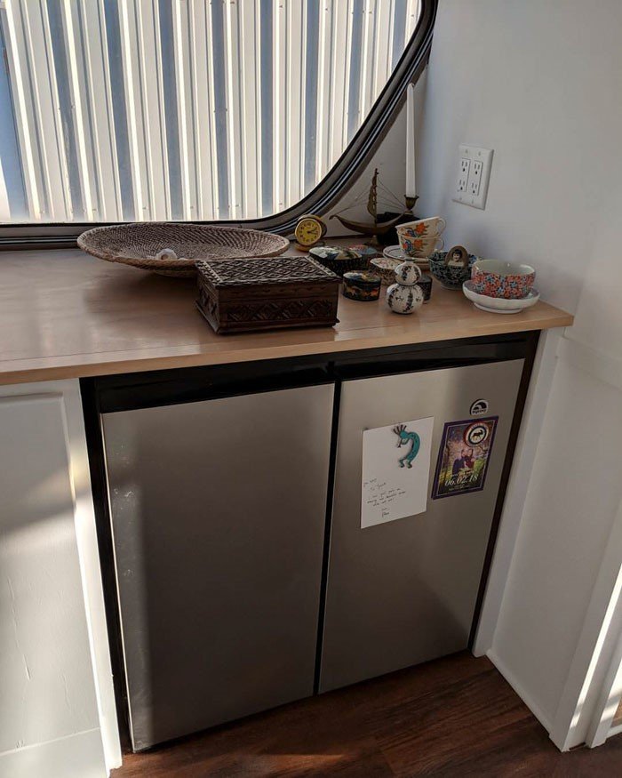 Аккуратный холодильничек на кухне занимает совсем мало места. Но его внутреннего объема с лихвой хватает Джесси для всех ее повседневных нужд.