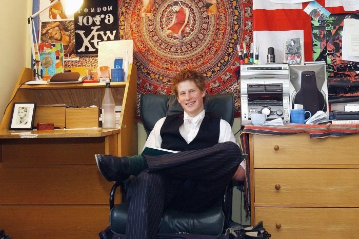 Принц позирует для фотографа в комнате Итонского колледжа.