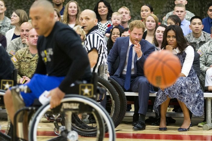 Вместе с тогдашней первой леди США Мишель Обамой смотрит баскетбольный матч американских ветеранов.
