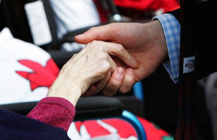 Гарри пожимает руку пожилой пациентки в одном из госпиталей Кардиффа.