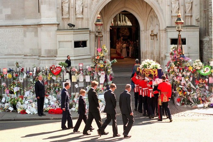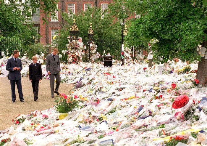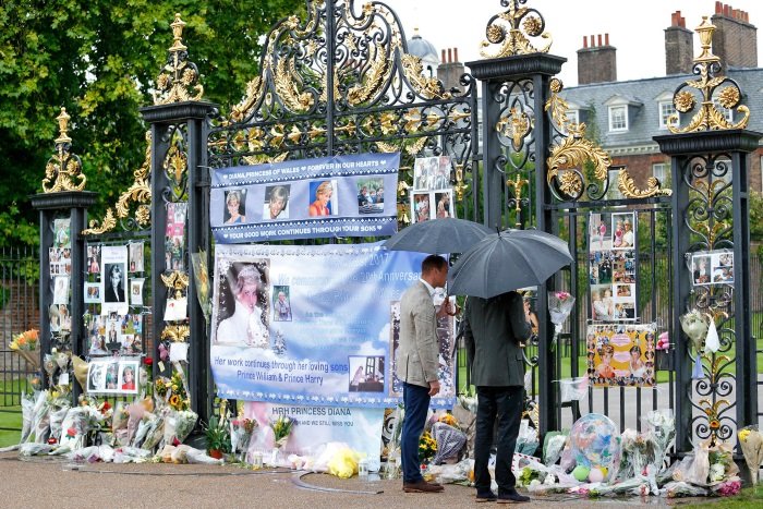 Принцы рассматривают плакаты, оставленные на годовщину смерти их матери в 2017 году.