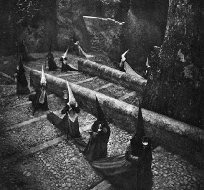 Люди на снимки выглядят как приспешники какого-то сатанистского культа. На самом деле это пасхальная процессия в Испании 1940-го года.