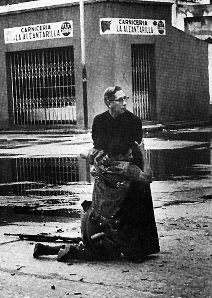 Католический священник Луи Падильо держит умирающего солдата, попавшего под снайперский огонь во время восстания в Венесуэле в 1962 году. Мужчина спас десятки жизней таким образом, поскольку у католиков убийство священника считается страшнейшим грехом.