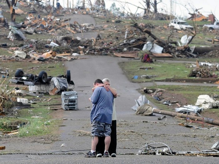 Мать с сыном стоят на руинах своего дома, разрушенного торнадо Тускалуса-Бирмингем, названного в честь городов, которые он уничтожил в 2011 году в штате Алабама, США.