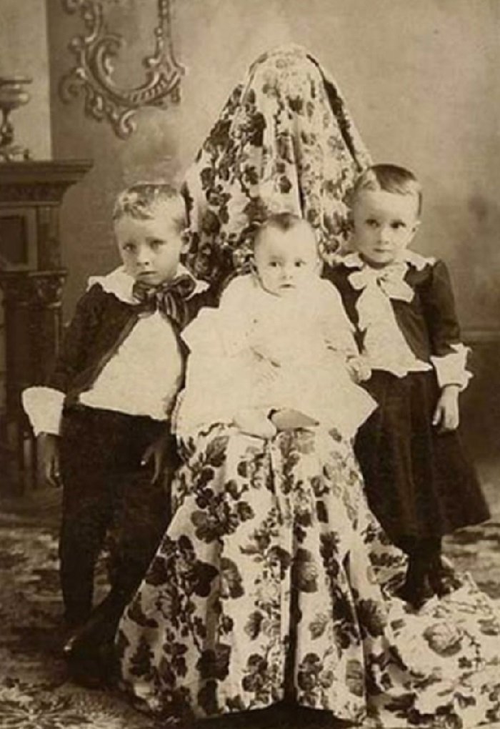 На самом деле человек на фото живой. Мать держала детей, чтобы они сидели спокойно, поскольку в то время камера долго фокусировалась на объекте. Фотографировали детей, а не маму, поэтому ее прятали под тканью.