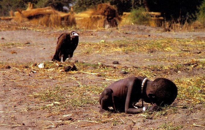 Снимок умирающей девочки из Судана, сделанный Кевином Картером в 1993 году в Судане получил Пулитцеровскую премию. В стране царила разруха и голод. Родители малышки бросили ее, побежав к прибывшему с гуманитарной помощью самолету.