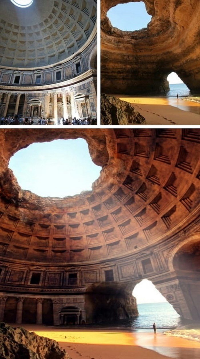 Ну а на фотографии ниже ты можешь увидеть, как создавали новость о «затерянном храме Лисистраты». Неведомый шутник взял снимок римского Пантеона, совместил его с фото из пещеры Альгар-де-Бенагил, что в Испании, и получил невозможно красивый кадр с древним храмом. Право, жаль, что храм этот существует исключительно в воображении какого-то юмориста!