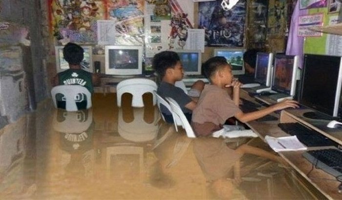 Эта фотография появилась в Сети в 2012 году после серьезного потопа на Филиппинах. Кадр, где дети спокойно сидят за компьютерами чуть ли не по плечи в воде, вызвал серьезное возмущение публики.